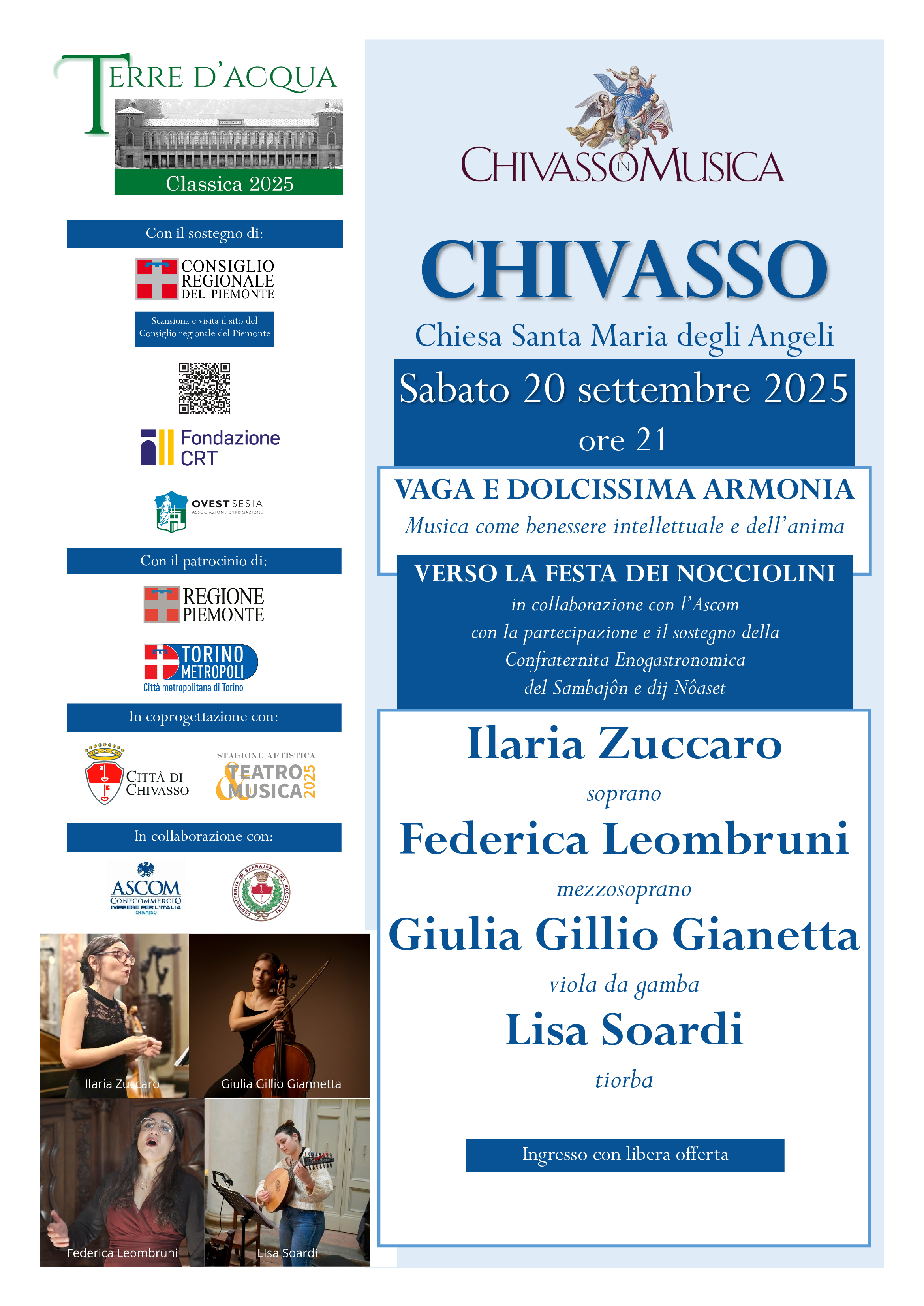 una passeggiata musicale sulla concezione dell’Amore nel periodo rinascimentale, in compagnia di un quartetto di musiciste formato da Ilaria Zuccaro (soprano), Federica Leombruni (mezzosoprano), Sara Campobasso (viola da gamba) e Lisa Soardi (tiorba). Si potranno ascoltare musiche di Banchieri, Strozzi, Monteverdi, Frescobaldi, Piccinini, Luzzaschi e Kapsberger.