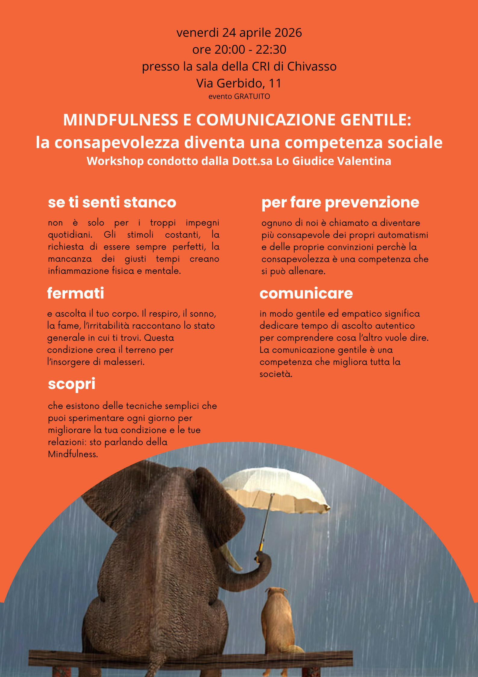Venerdì 24 aprile, dalle ore 20.00, nella Sala della Croce Rossa Italiana, si terrà il workshop “Mindfulness e comunicazione gentile: la consapevolezza diventa una competenza sociale”, condotto dalla dott.ssa Valentina Lo Giudice.