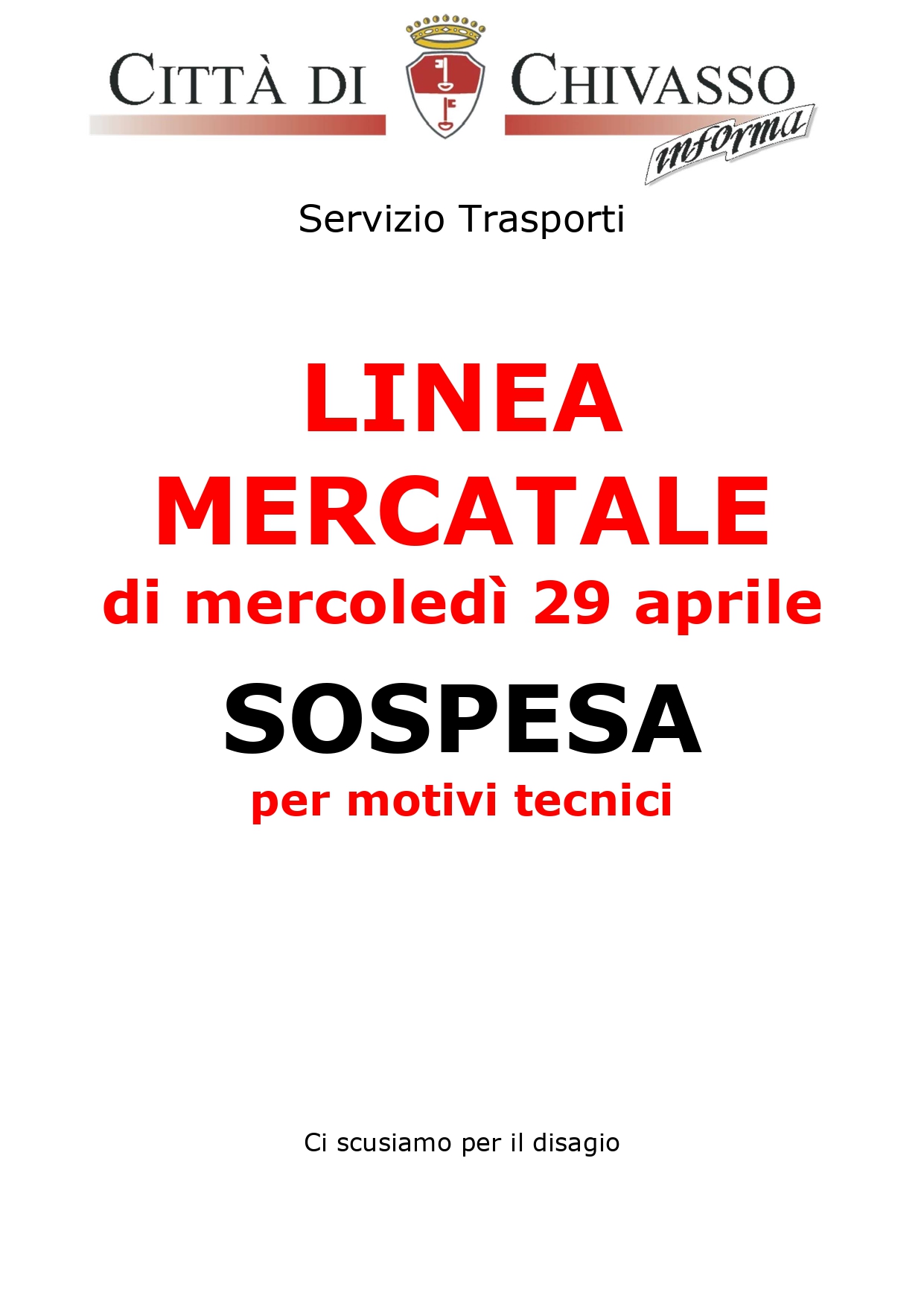 A causa di improvvisi motivi tecnici, la Linea Mercatale di mercoledì 29 aprile non potrà essere attiva.