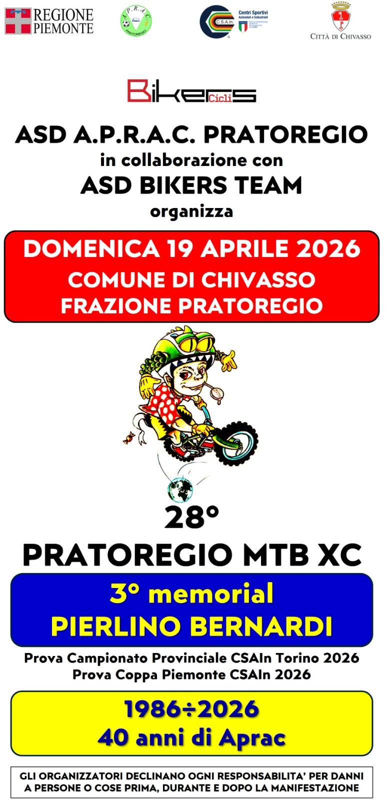 Domenica 19 aprile la frazione Pratoregio di Chivasso ospita il 28° Pratoregio Mountain Bike Cross – 3° Memorial Pierlino Bernardi, una delle gare più attese del territorio, organizzata da ASD A.P.R.A.C. Pratoregio in collaborazione con ASD Bikers Team.