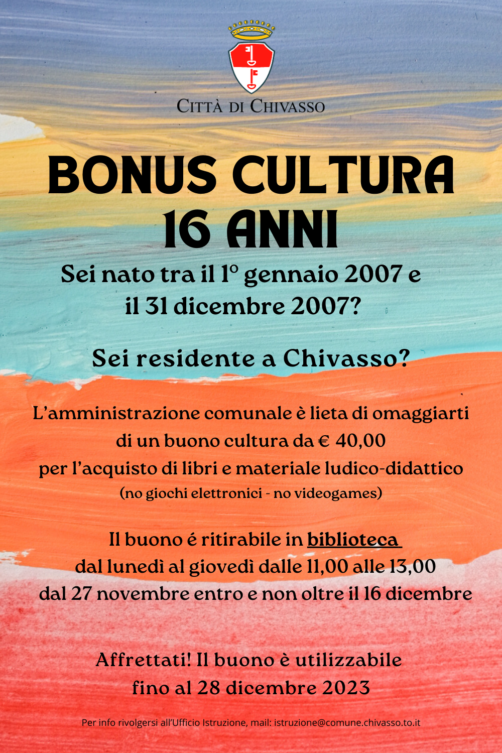 Sono 246 a Chivasso i giovani sedicenni che hanno diritto al bonus cultura da 40 euro introdotto dall’amministrazione comunale, su proposta dell'Assessorato alla Cultura. I nati fra il I gennaio ed il 31 dicembre 2007, presentando il proprio documento di riconoscimento agli sportelli della biblioteca civica Movimente, dal lunedì al giovedì dalle ore 11 alle 13 fino al prossimo 16 dicembre, possono richiedere i buoni cartacei, spendibili in città entro il prossimo 28 dicembre, per l’acquisto di libri, giochi di società e altri articoli analoghi.