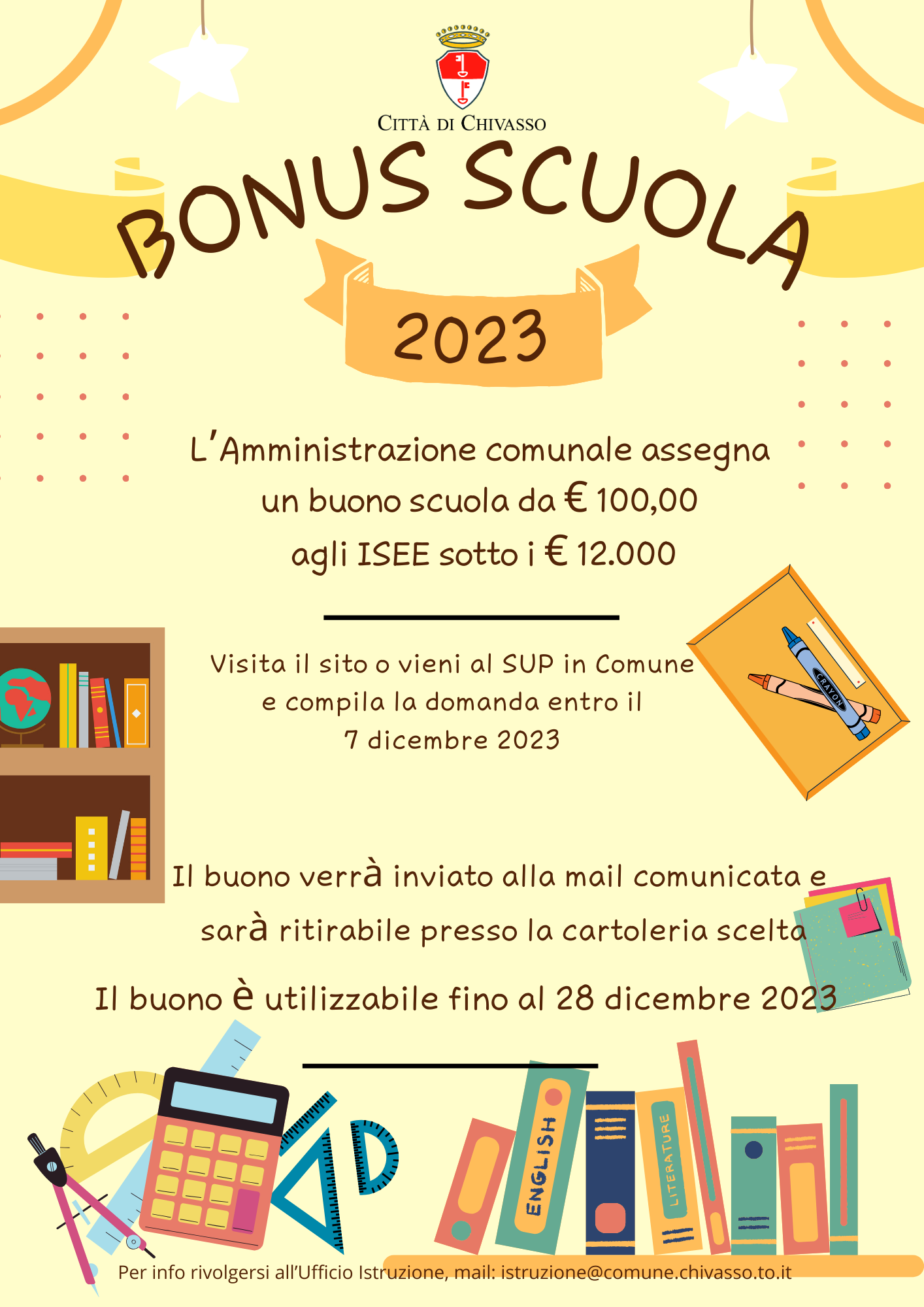 Intanto, fino alle ore 12 del prossimo 7 dicembre, è possibile presentare on line o allo Sportello Unico Polivalente anche la richiesta per ottenere il Buono Scuola del valore di 100 euro a nucleo familiare, riscattabile in cartolibreria per l’acquisto di materiali e strumenti necessari per lo svolgimento delle attività scolastiche. In questo caso, ne hanno diritto le famiglie con minori iscritti alla scuola secondaria di 1° e 2° grado o ad un’agenzia formativa ed una condizione economica relativa all’Isee, rilasciata nel 2023, corrispondente a valore non superiore a 12 mila euro. Maggiori dettagli sono consultabili dal sito del Comune di Chivasso.